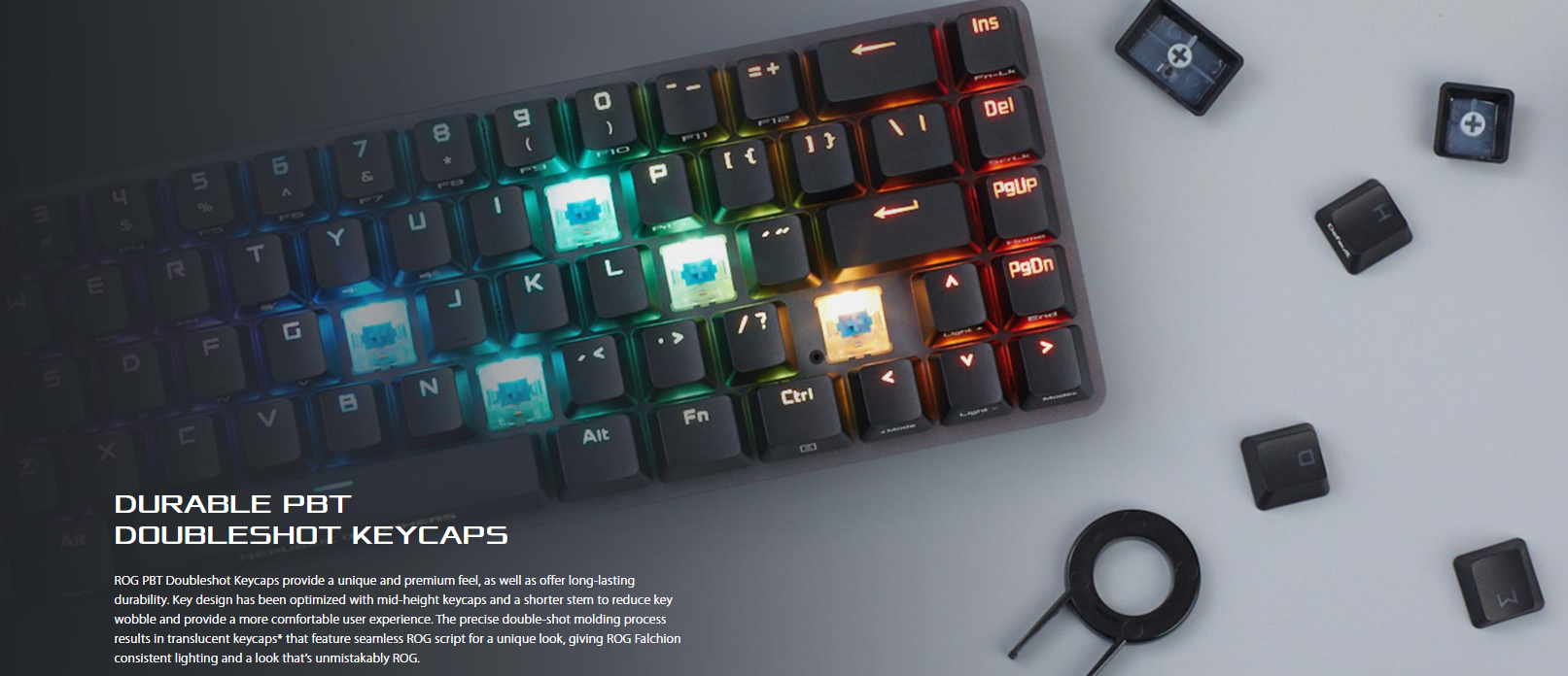 • Durable and long-lasting ROG PBT doubleshot keycaps (keycap material may vary by region)