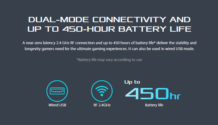 • Dual-mode connectivity via wired USB and 1 ms at 2.4 GHz RF, and up to 450 hours of battery life* offer stable, long-lasting performance (*with RGB lighting off)