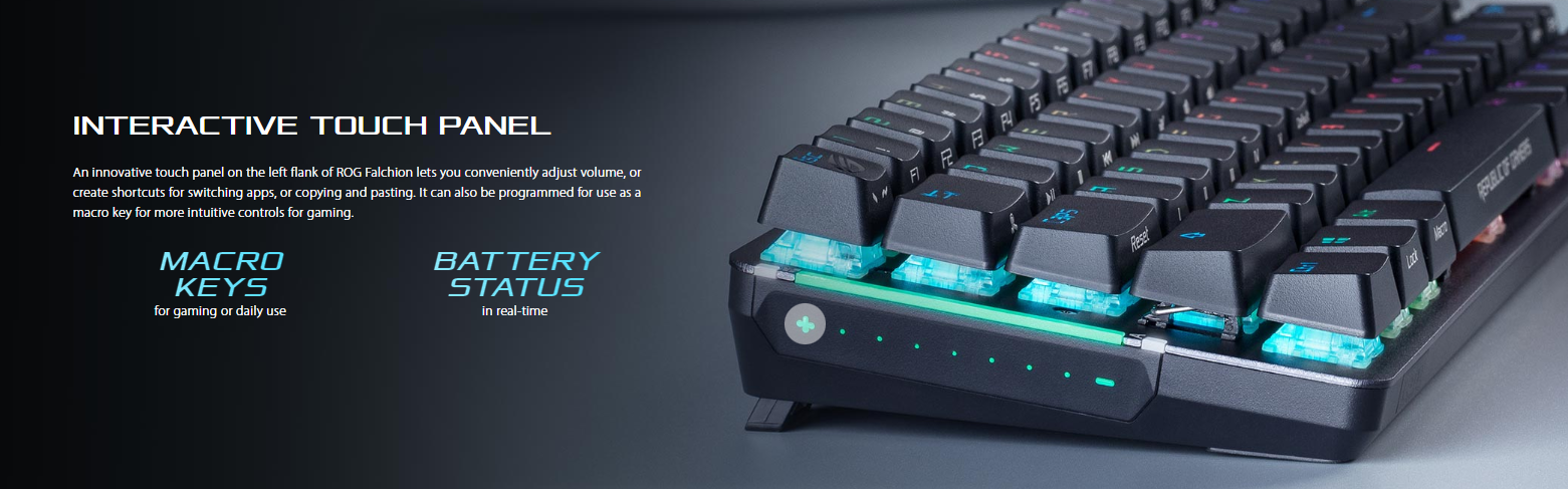 ROG Falchion 65% wireless mechanical gaming keyboard with 68 keys, wireless Aura Sync lighting, interactive touch panel, keyboard cover case, Cherry MX switches, and up to 450-hour battery life