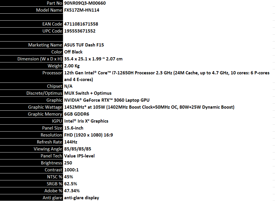 LAPTOP ASUS TUF DASH 15.6" i7-12650H SSD1TB RAM16 DOS 3060 - watanimall Skip to Content Contact Us